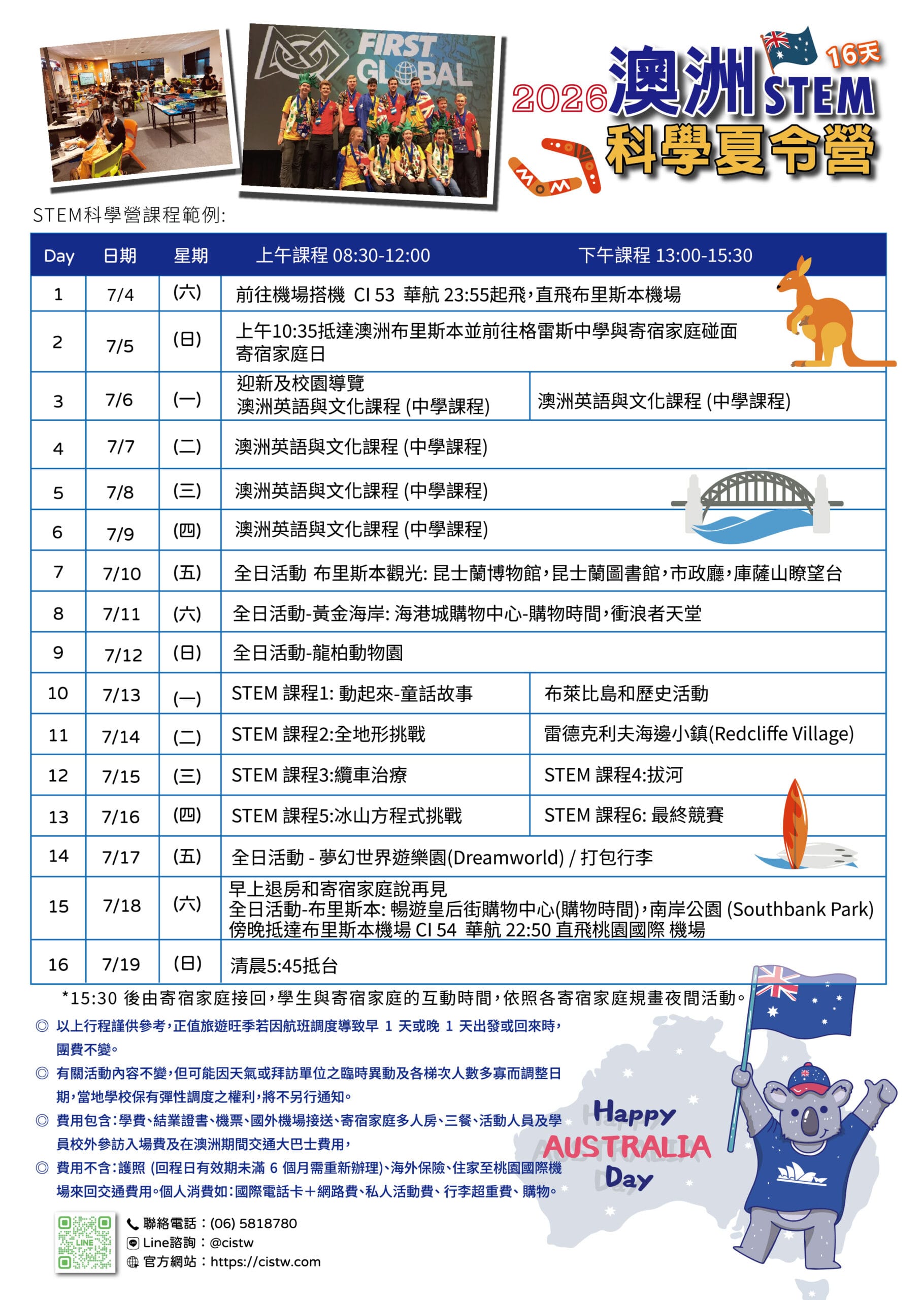 註:每日15:30後回寄宿家庭,晚間互動時間依各寄宿家庭規劃為準;行程可能因天候/航班/合作單位安排調整,以安全與整體安排優先。